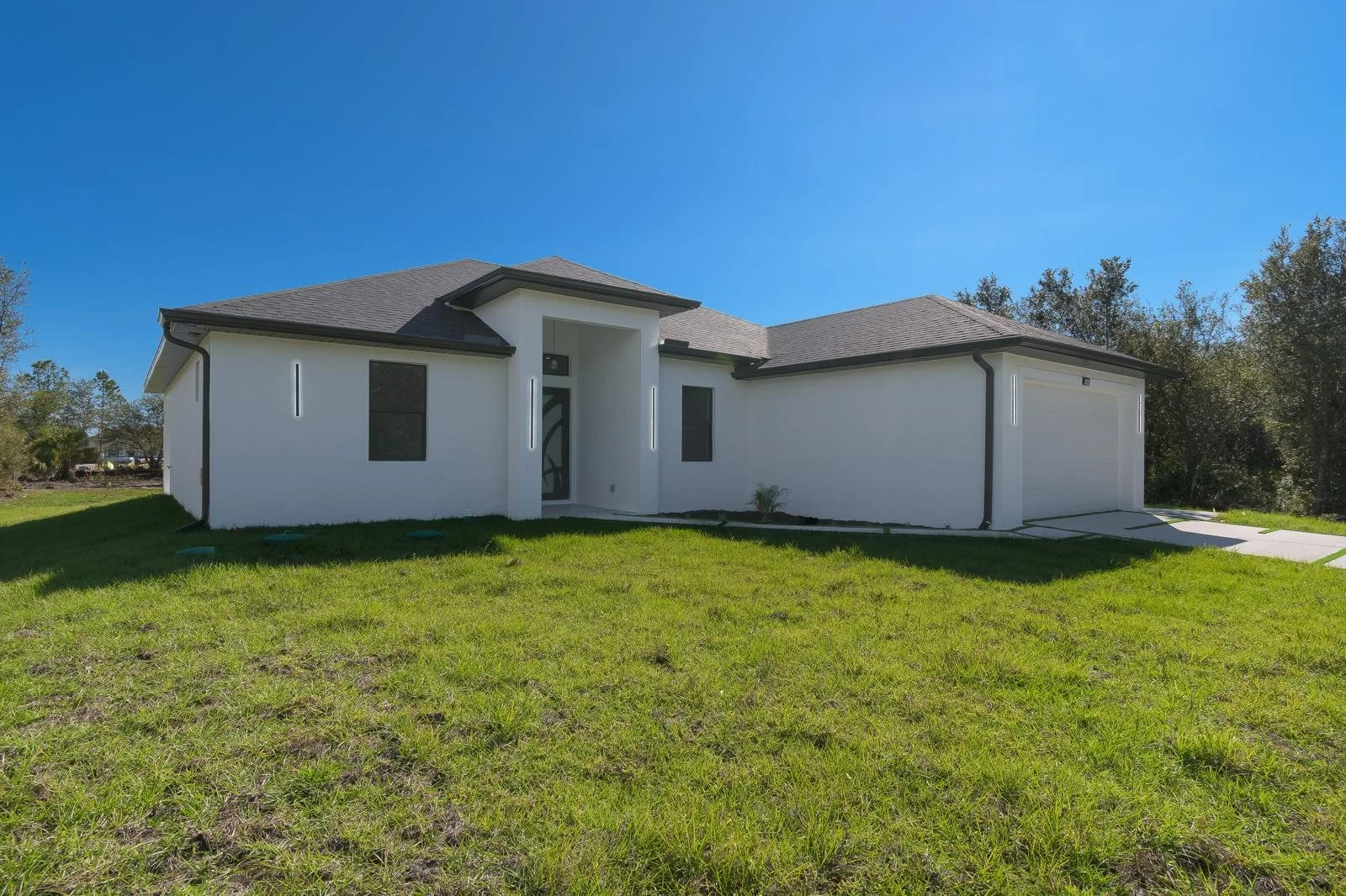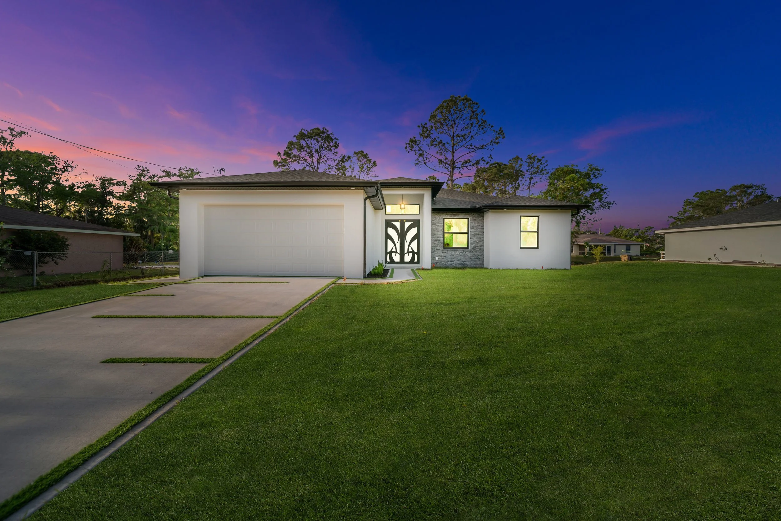 Modern single-family house with a white exterior, black front entrance door, attached garage, and well-maintained green lawn during dusk with a colorful sky.