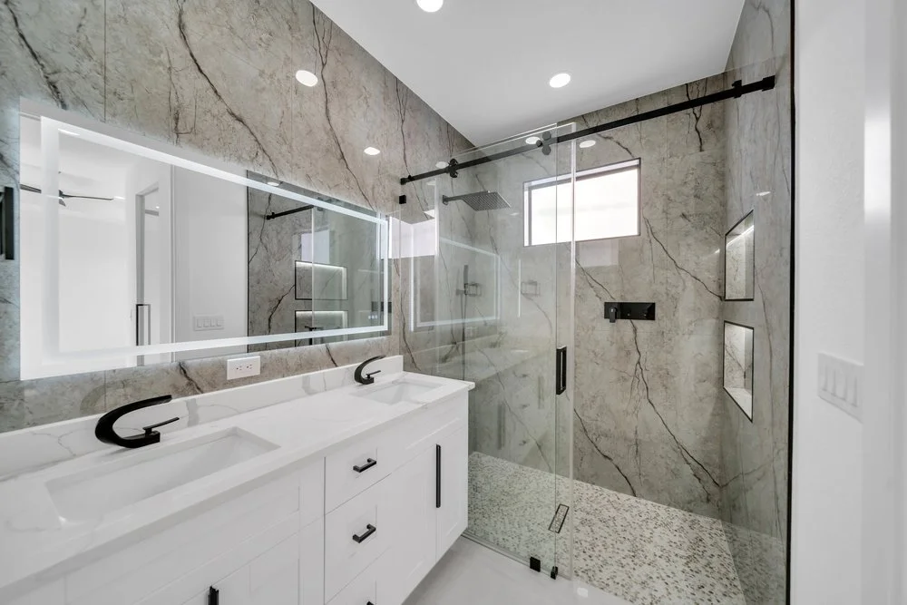 Modern bathroom with large mirror, double sink vanity, and walk-in shower with a sliding glass door. The shower has a built-in niche and a small window, with marble walls and shower floor.