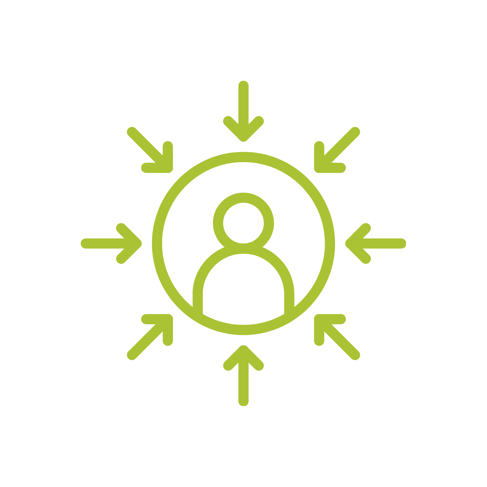 Green outline icon of a person surrounded by arrows pointing inward from all directions.